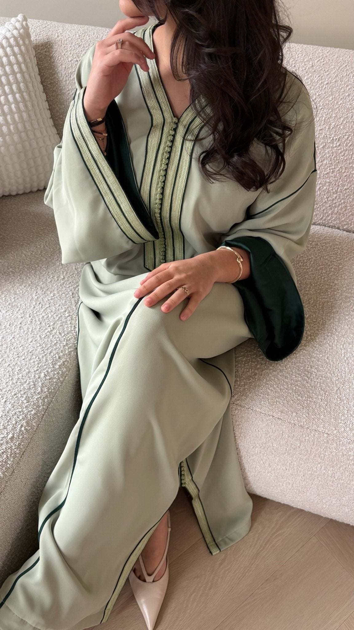 The Qaftan Amira in Pistachio x Green is where fresh tones meet timeless Moroccan design. This elegant one-piece qaftan features a soft pistachio satin base, enriched by deep green satin cuffs and structured embroidery along the neckline and center. The contrast piping and minimalist silhouette add a contemporary edge to its traditional roots.
