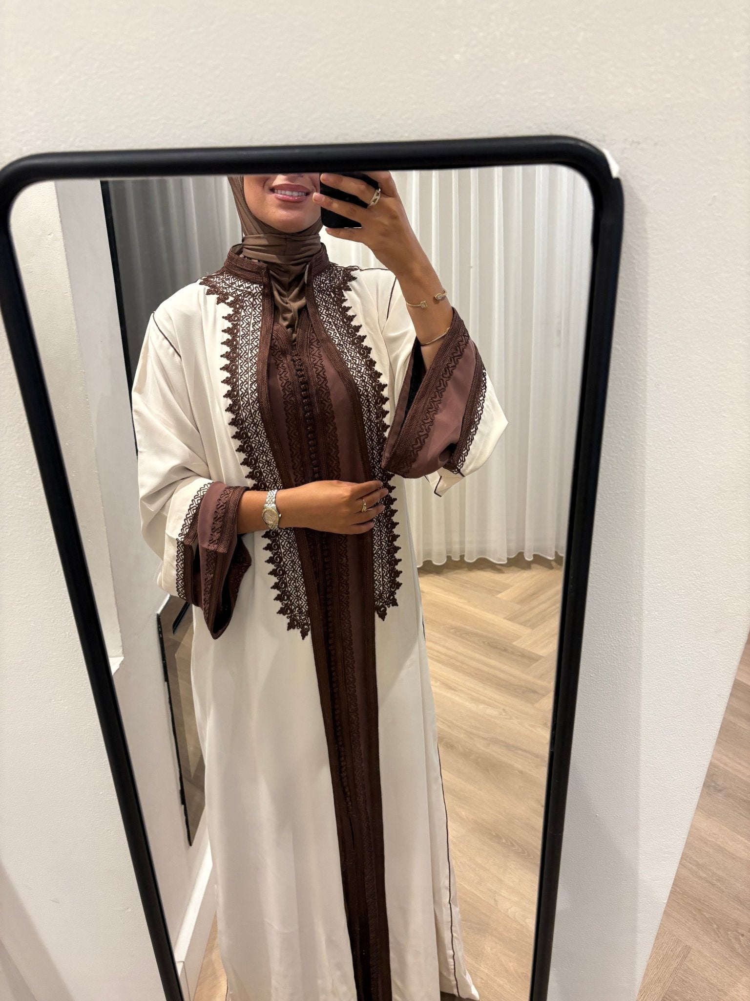 Step into timeless elegance with the Royal Essence Kaftan. Crafted in a luxurious cream hue and adorned with rich chocolate-brown embroidery, this piece radiates regal sophistication. The flowing fabric and intricate detailing create a graceful silhouette, perfect for making a royal statement at any occasion.